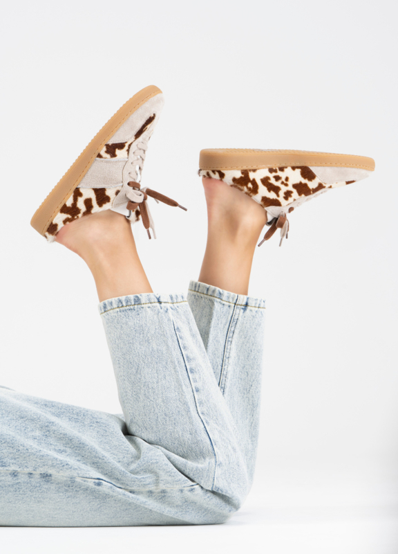 De Nome instap sneaker met dubbele veter is een echte blikvanger! Door de veters aan de voorkant los te maken, kun je de sneaker verstellen en er gemakkelijk instappen. Door het randje aan de achterkant blijft je voet comfortabel in de schoen zitten terwijl je loopt. De sneaker is aan de buitenzijde gemaakt van suede stof met koeienprint en aan de binnenzijde gemaakt van leer. Doe jij mee met deze nieuwe trend?